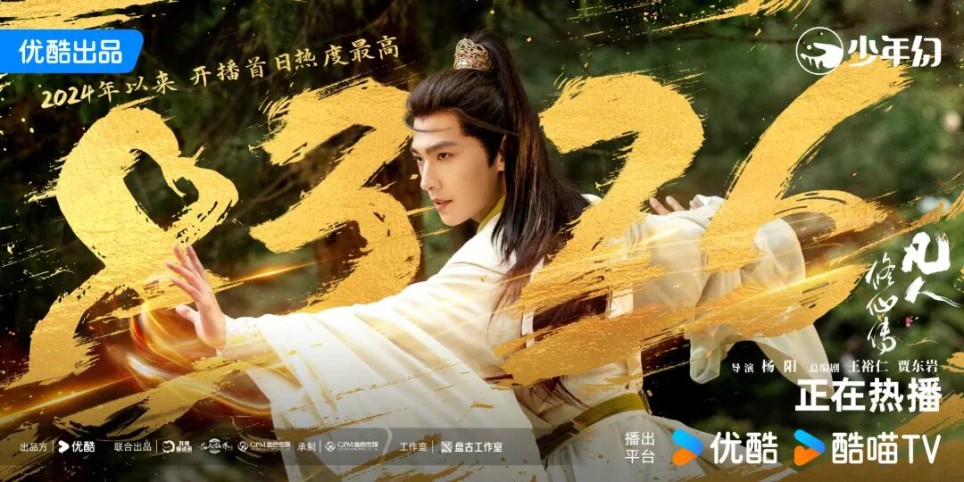 剧版《凡人修仙传》开播⾸⽇热度达8326,创下优酷2024年以来开播⾸⽇热度最⾼纪录;播出第三天热度值即破万。